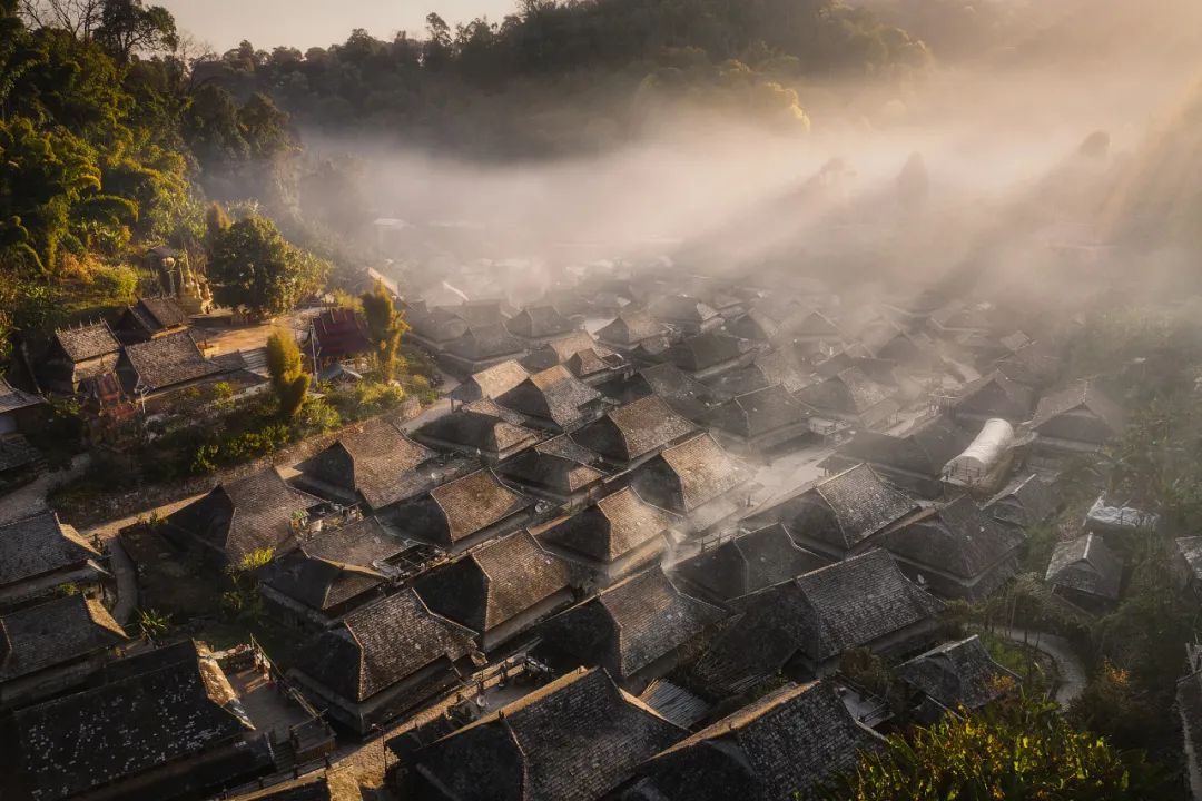 在滇南的澜沧江流域,布朗族、傣族都居住在竹木结构的干栏式民居中,在重重叠叠的茶园、梯田中,他们以“一芽两叶”或黄牛角的屋脊装饰,标记出自己的文化特色。不同民族共享着相似的经济方式与习俗传统,景迈山中的古老茶林由不同民族共同传承,傣族的泼水节狂欢和布朗族的山康节活动,会在同一天上演。