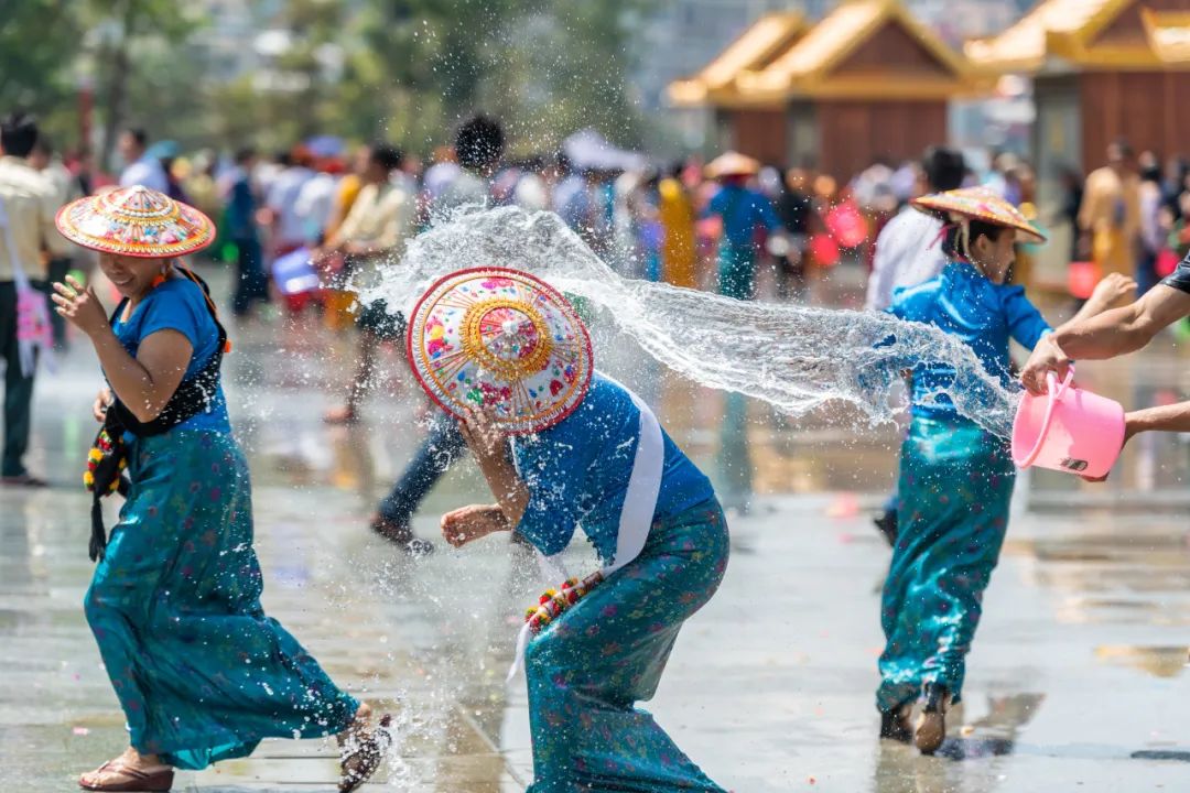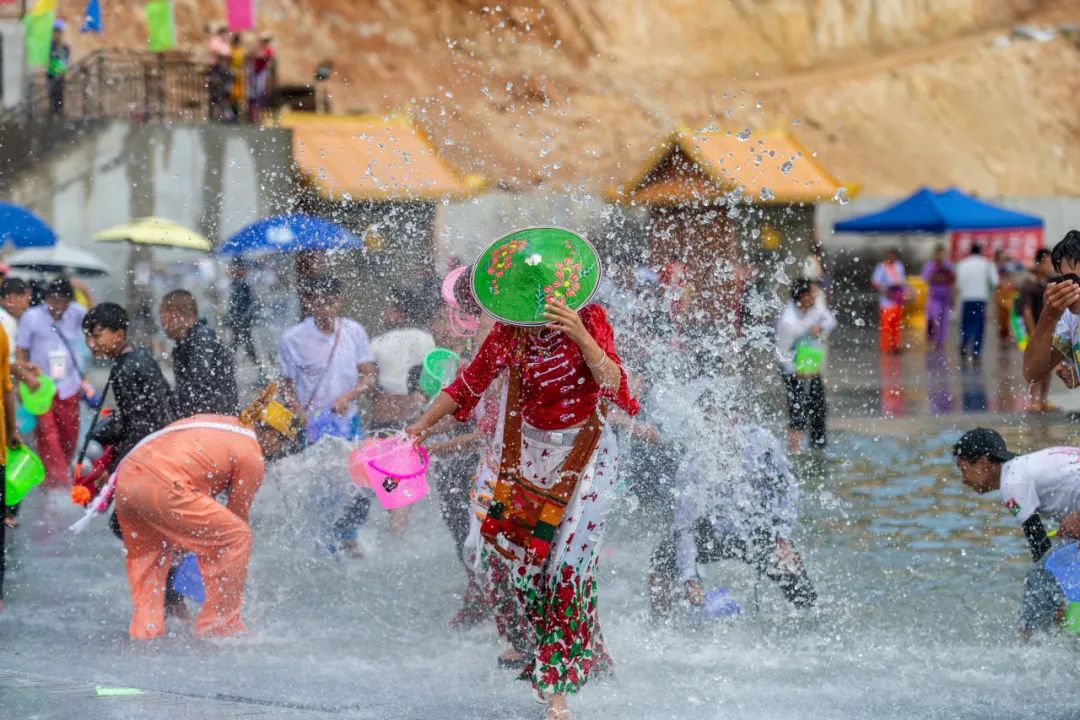 人们在泼水节时用清水相互泼洒,祈求洗去不顺、迎来祝福