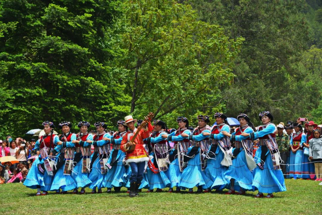 普米族群众在游山节上“一步望四乡”,也在四弦琴的琴声中跳起一轮又一轮的“羊皮舞”,或在七月十五加入转山的队伍,跟随人们“过水”“过烟”,在狮子山头欢歌竞夜。