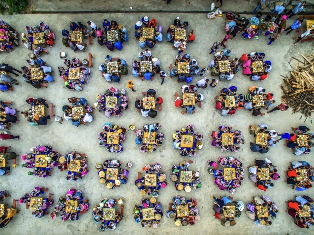 独龙族会在岁尾年初时,家家挂起彩色的披毯,独龙江畔连续数日的“卡雀哇”,祈祝着来年的丰收,人们用通宵的篝火与歌舞来迎接新年。