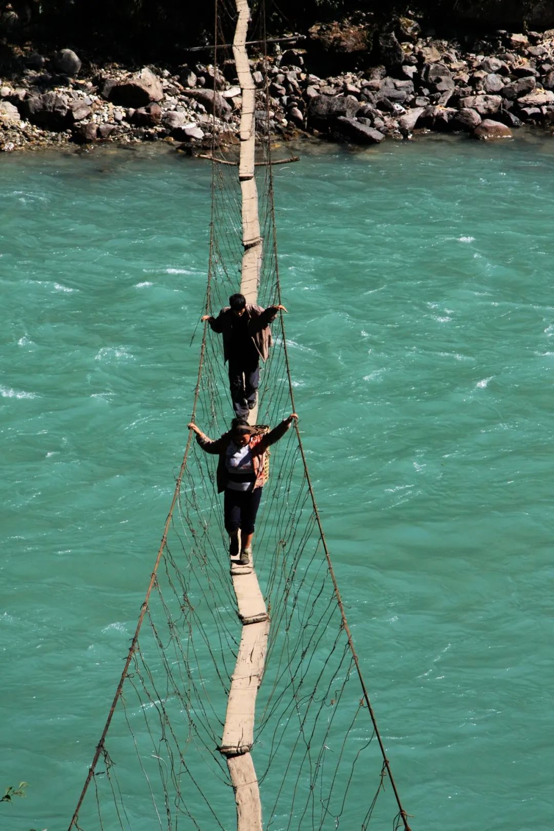 左图:藤篾桥是过去独龙江上常见的生产生活用桥