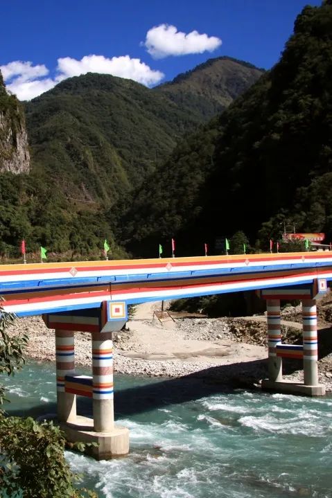 右图:从藤篾溜索到座座彩虹桥飞架独龙江两岸,独龙江不再是阻碍两口独龙族群众生产生活的险阻