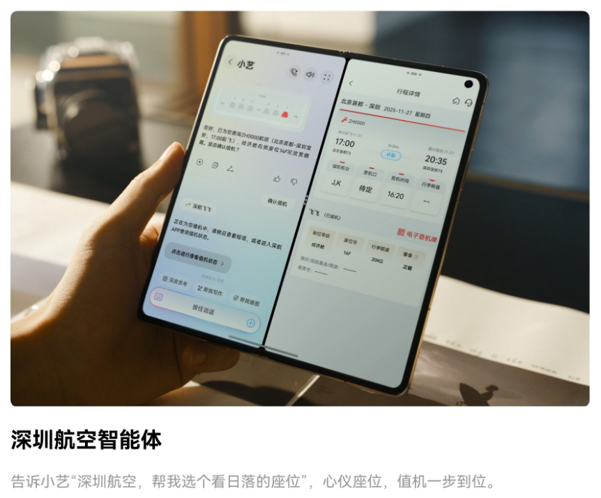 效率提升还体现在鸿蒙操作系统6搭载的商用的A2A智能体协作技术上。该技术实现了跨应用的智能联动,例如通过语音指令“深圳航空,订周五上午去上海的机票”,系统可完成查询并推荐航班、下单的全流程;在行业研报调取场景中,只需说“东方财富,帮我提供一些股票信息”,相关的股市热点、市场洞察及行业趋势分析便会分屏呈现。