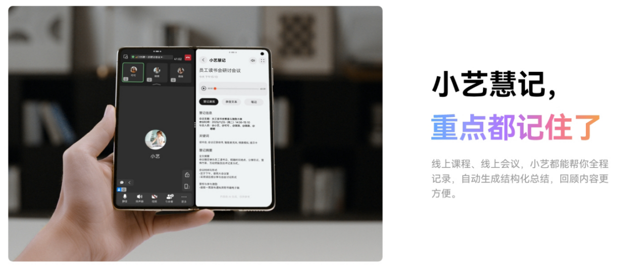 会议场景的细节优化更显技术温度。小艺慧记的实时语音转写功能可精准识别发言人并标记,更可以在会后生成摘要以供查阅。