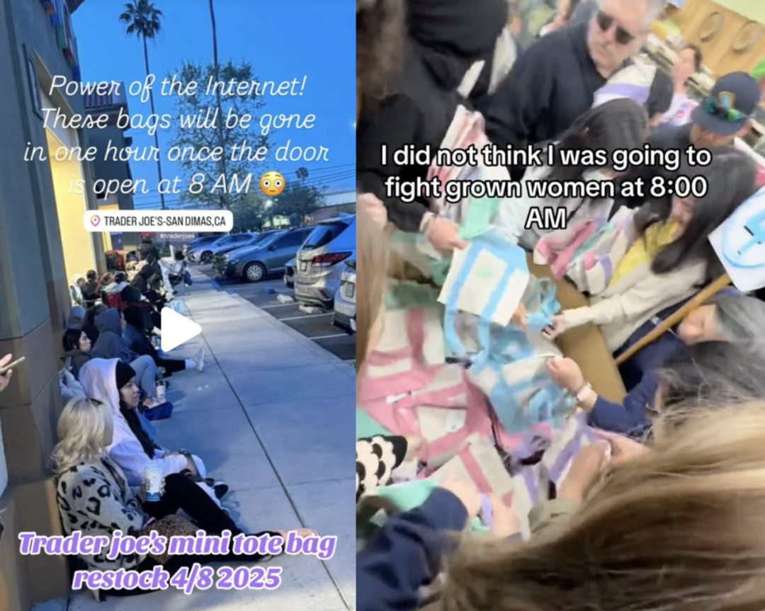 这两年,美国连锁超市“缺德舅”(Trader Joe's)的购物袋意外爆红,引发了堪比Stanley保温杯和泰勒·斯威夫特周边产品的抢购热潮。这款售价2.99美元的迷你手提袋在全美各地迅速售罄,据报道,一些门店甚至不得不限制顾客的购买数量。网上流传的视频显示,热情的顾客蜂拥而至,抢购补货的迷你手提袋,“就像海鸥在海滩上争抢洒出来的薯片一样。”在二手市场一套这样的包包标价高达499美元。