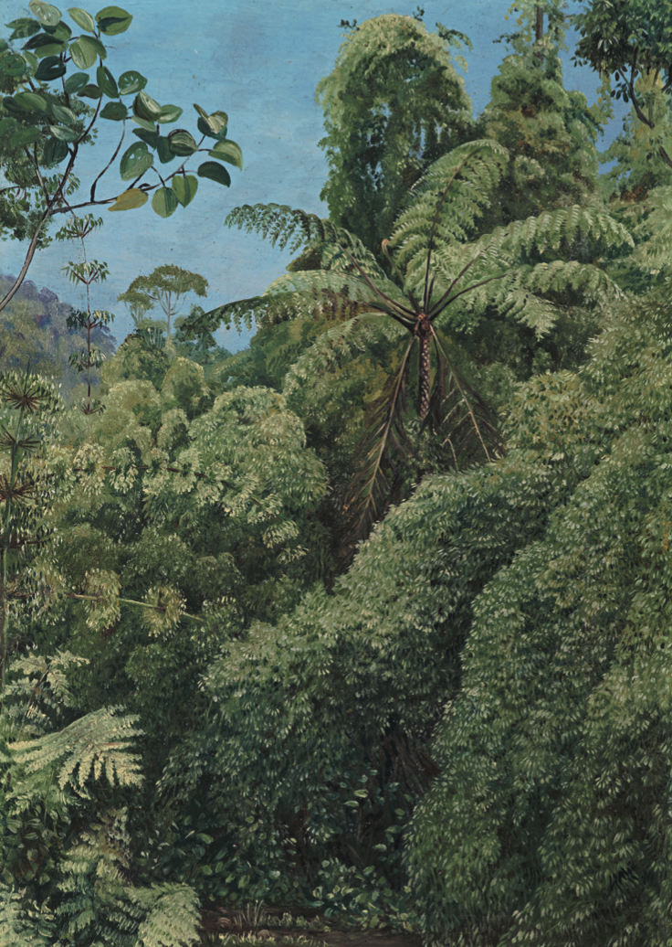 你会看到一种细长的树蕨(注:牙买加桫椤Alsophila grevilleana),它的叶子像织物的花边一样,这种树蕨从一大堆匍匐的蕨属植物中长出来,那些匍匐的蕨覆盖着地面,爬上了所有的河岸和树木,呈现出奇妙的苹果绿色调;