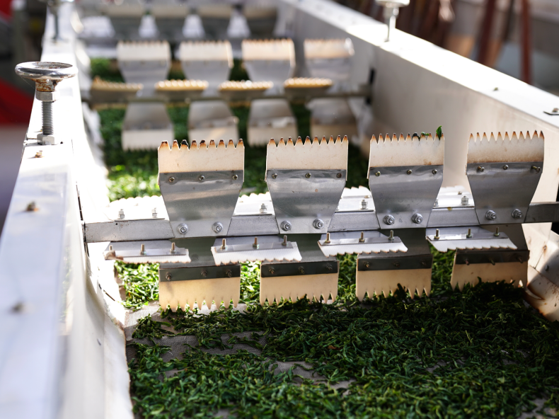 古碑宋河村属马鬃岭风景区地块,这里的群体种土种生长环境温差大,通常要到四月中旬才开始采制。“瓜片是不做雨天的茶叶的,前天开晴,这两天的鲜叶品质好。”赶上好天气,车间里的设备全开,从杀青、揉捻、理条、初烘、色筛、烘干,自动化设备轰鸣全开,解主任来回在每台加工设备前中看青、闻香气,调整设备参数,再过几个小时这批代加工的毛茶,将被送往大厂完成接下来的精制整理。