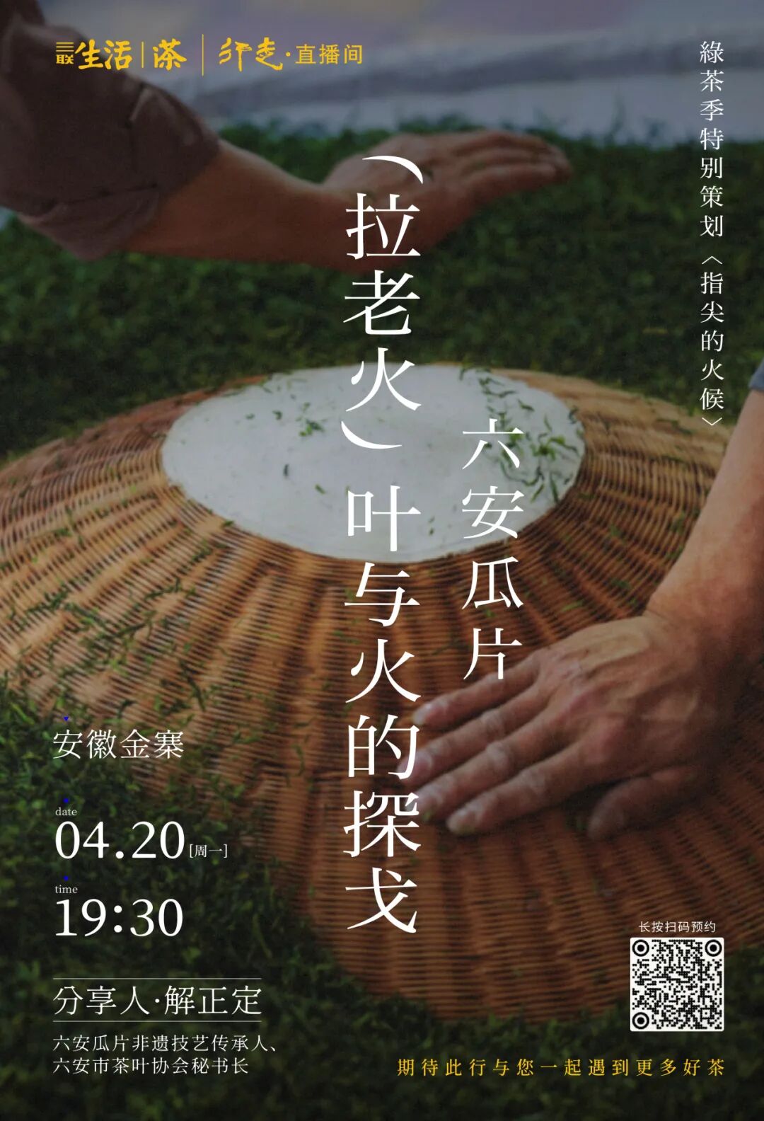 4 月 20 日 19:30,三联生活市集的直播间的灯光亮起,让我们跟随六安瓜片的非遗技艺传承人、六安市茶叶协会秘书长解正定先生,走进拉老火的世界。