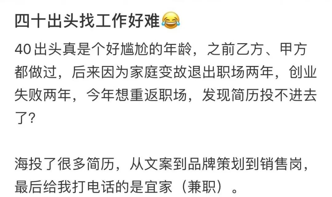 环顾四周,她周围的同龄人,不是已经做稳公司高层,就是回家当了全职主妇,“职场几乎不给中年人提供缓冲带。”