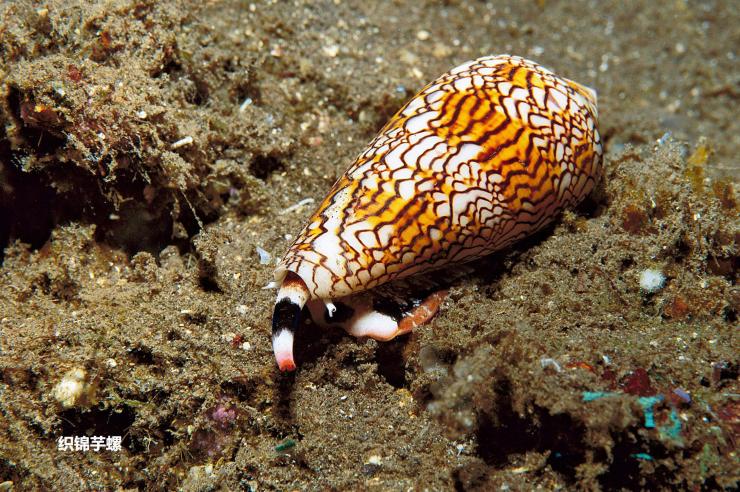 最可怕的就属织锦芋螺了,这类的螺在壳上有一堆像「山」的图案,身体内具有箭齿,牠们可以把带剧毒的箭齿像吹箭一样射出来,射中毒死鱼之后,再包裹食用。也就是说,牠们是猎捕者。当人在离海岸线远一点的地方被牠射中,很可能就游不回岸上了。我曾在鼻头角看到过两只活体,那时真的是带着害怕的心情接近牠。