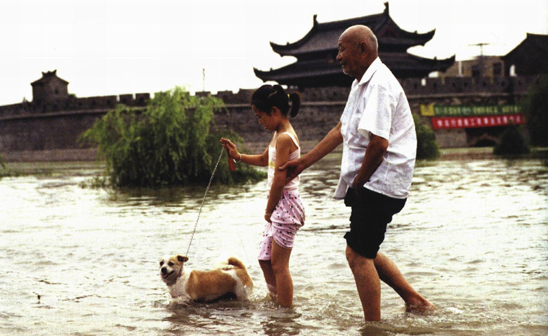 安徽省寿县被洪水围困,只剩一条通道。7月12日,一位老人带着孩子从城北门趟水前行,此时的古城北门已经封闭