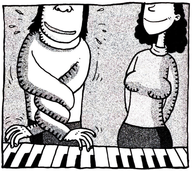 再说我们的键盘手吧,他是个老实人,琴弹得还行。有一天在舞会时,一个正学电子琴的PLMM紧挨着坐在他身边,很认真地看他弹琴,我们都在想这小子还不心猿意马,今晚怎么也得弹错几个音。结果,那晚楞没错一个音!但就是低音出得少,几乎没有!我们都觉得很奇怪,心想是不是琴坏了,开完舞会问他,结果他说他没敢弹。我们才明白。原来那女孩坐在他左边,而键盘乐器都是左边低音,右边高音,他想要弹低音,得把手越过女孩的胸前,才够得着低音键,这样手就有可能碰到女孩的胸部。他为了避免不碰别人的胸部,又舍不得她离开,解决的办法居然是整个晚上舍弃了低音!