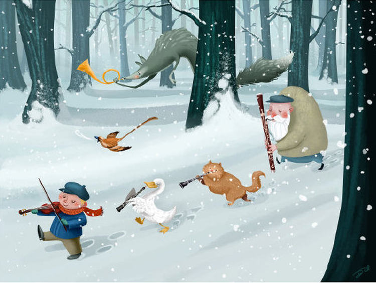 既然是为小朋友写的作品,我觉得普罗科菲耶夫还是有意地没有使用太过于另类和新颖的创作手法。但是我觉得还是有着他浓烈的个人特色的,初听还是会觉得味道蛮独特。故事情节其实非常简单,彼得是正面人物,狼是反面人物,这跟我们很多童话都是一样的,类似于小红帽和大灰狼。因为狼首先把鸭子给吃了,后来彼得跟他的爷爷还有猎人齐心合力把这狼给抓住了,但是并没有把它杀死,而是送进动物园,之后还把这狼给放回了大自然,是这么一个故事。