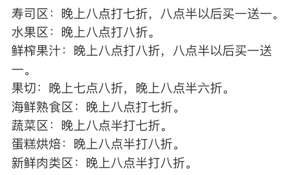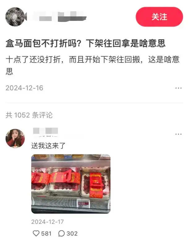 在小红书上盒马“穷鬼超市”的帖子下面,你常能看到坐标相近的年轻人,向对方分享着具体门店的折扣信息:从寿司区、水果区到海鲜熟食区,信息颗粒度可以精确到以分钟和具体柜台为单位。