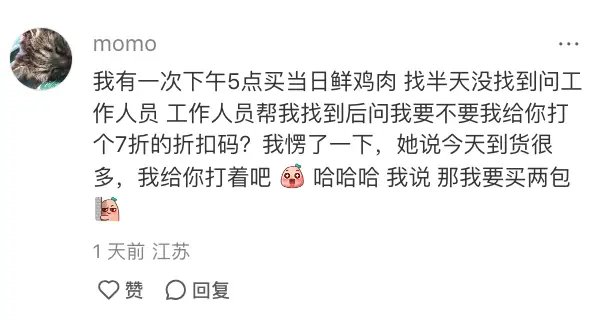 还有些打折玄学,则类似于游戏中不经意触发的支线任务,枫车有次在等折扣价时随口感叹到,“等老了之后,抢鸡蛋肯定没人抢得过我”,结果“工作人员看我这么积极,就把菜品单独拿到一边贴了折扣签给我”。