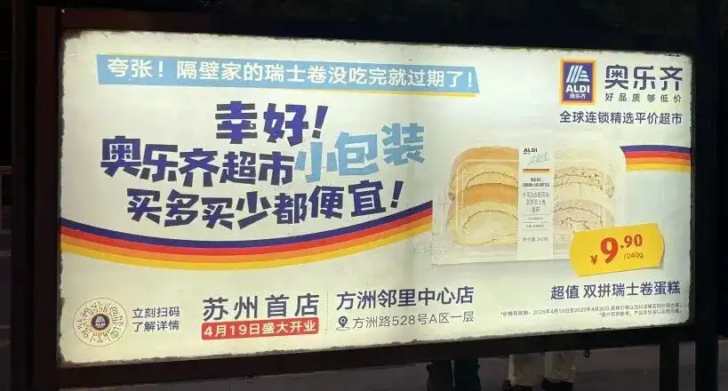这也便成了如今“穷鬼超市”在国内遍地开花的基础,刚刚走出上海、在江苏和无锡开出两家新店的奥乐齐,可以说是风头正盛——如今在山姆门店前“贴脸开大”给自己打广告的超市,也从当年的盒马变成了奥乐齐。