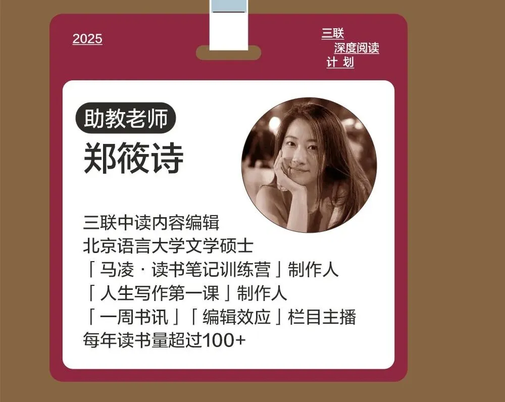 同时,我们还请来了专业的助教老师郑筱诗,她是我们的内容编辑,也是《马凌·读书笔记训练营》《人生写作第一课》的制作人,还是三联中读《一周书讯》《编辑效应》的栏目主播,每年的读书量远超100本。
