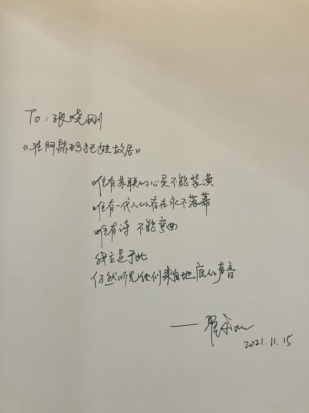 电梯空间则被改造成一个狭小的卫生间:瓷砖、镜子、窄小的洗手盆、冷白的灯光,灵感来自张晓刚与崔灿灿一次“高铁经验”,摇晃的狭窄空间勾勒出“现实的幻觉”,生活的肌理和艺术的梦境在这里相互渗透,一个“心理的镜像”,让观众被迫直面的空间,像镜中之梦。展览的终点是翟永明的诗句——“那些来自苏联的声音,并不会被遗忘。”诗洇进墙内,如同时间的余音,整个展览最终成为一个心理剧场:绿墙是心壁,灯是时间的神经,抽屉是记忆的索引,厕所是现实的隐喻,诗是梦的出口。观众在行走中成为自己的读者,而时间则在被阅读的同时被重新书写。
