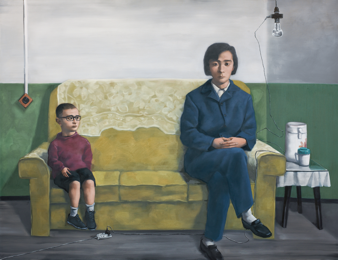 2000年前后的《失忆与记忆》系列,是张晓刚对时间结构的重新思考。与《大家庭》以图像的统一性建构集体记忆不同,《失忆与记忆》将注意力转向个体的心理时间。画面中的空间被扭曲为倾斜的室内,物体漂浮、光线断裂、人物的目光游离,一切都处于失重状态。张晓刚希望通过绘画表现时间的非线性,让过去、现在与未来同时显现于同一画布之上。他说:“我不再相信线性的时间。我相信记忆,它不是流逝的,而是反复出现的。”在这一系列中,绘画成为一种心理装置,时间被当作物质来切割、叠加、反射。