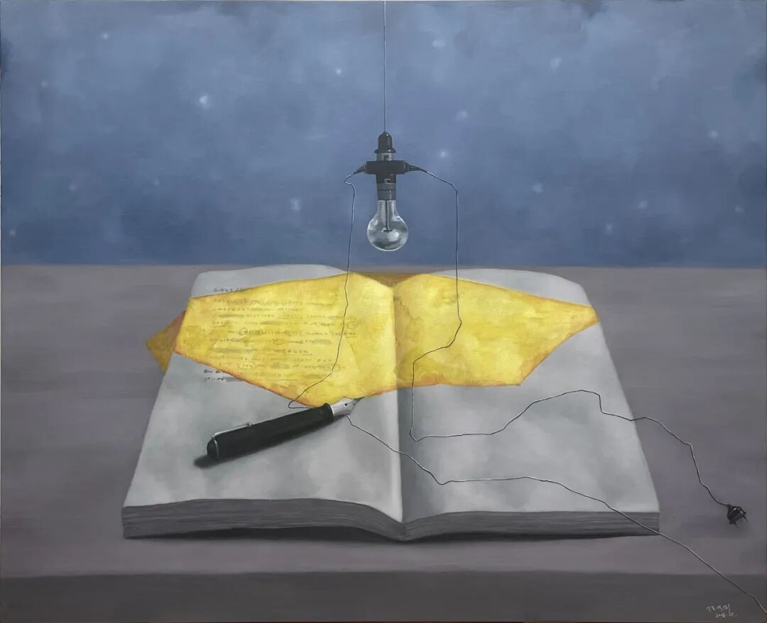 我始终觉得,艺术应该是每一个人都能和它发生关系的事情,而不是只有某些“神话般的人”才能完成的事。我画的其实都是自画像——不是外貌,而是时间里的自我。那些画里的灯泡、搪瓷缸、纸片,它们都在提醒我:人是会犹豫、会纠结、会犯错的。这些矛盾,这些不完满,就是“人之常情”。我希望作品永远能留住这种感觉。在疫情那几年,我常常想起“仰望星空”这件事。那时候被困在房间里,我就在想,仰望星空是什么感觉?希腊人因为仰望星空而产生哲学,我特别喜欢这句话。我画的不是象征,而是人自己——那种还会被光照着、还会相信温度的普通人。