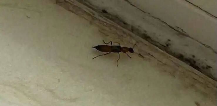 马笠卧室窗台上的隐翅虫。身体细长,黑红相间。(受访者供图)