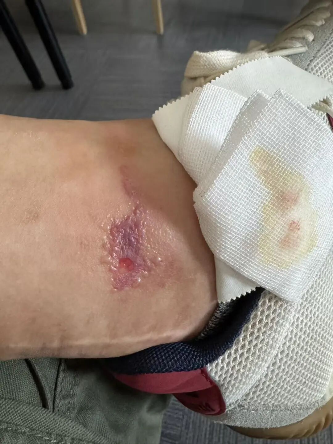 在天津生活的栗先生,九月底在户外人工草坪上踢过一场球,四五点结束时,发觉球袜边缘有点痒,他以为自己被黑白花纹的蚊子给咬了,没太当回事。但回家第二天,他发现自己的脚踝肿起了硬币大小的“红包”,他喷了些驱蚊水,仍旧没在意。到了晚上,他感觉更痒了,“红包”往外扩散出一条小尾巴,中心还起了很多小水泡,又痒又疼。虽然不是剧痛,但持续不适,且有“渗液”出现。他在网上查资料,一一比对虫咬伤口的形状和病程,最后自我确诊为隐翅虫皮炎。