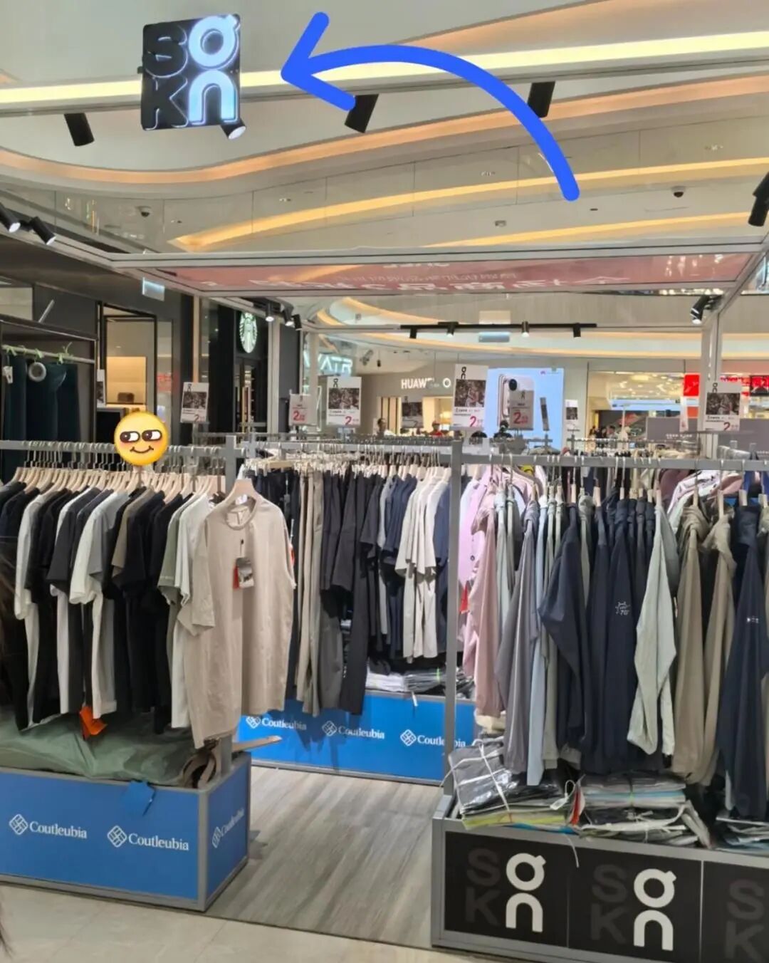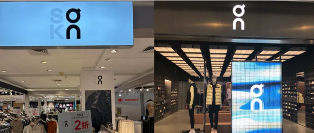 在线下,你能在北京合景魔方等商场的中庭或奥莱区,见到名为 “SKON”、“OKNP” 的店铺,其装潢刻意采用昂跑标志性的灰白黑色调与极简线条,足以让匆忙的消费者一眼误认。