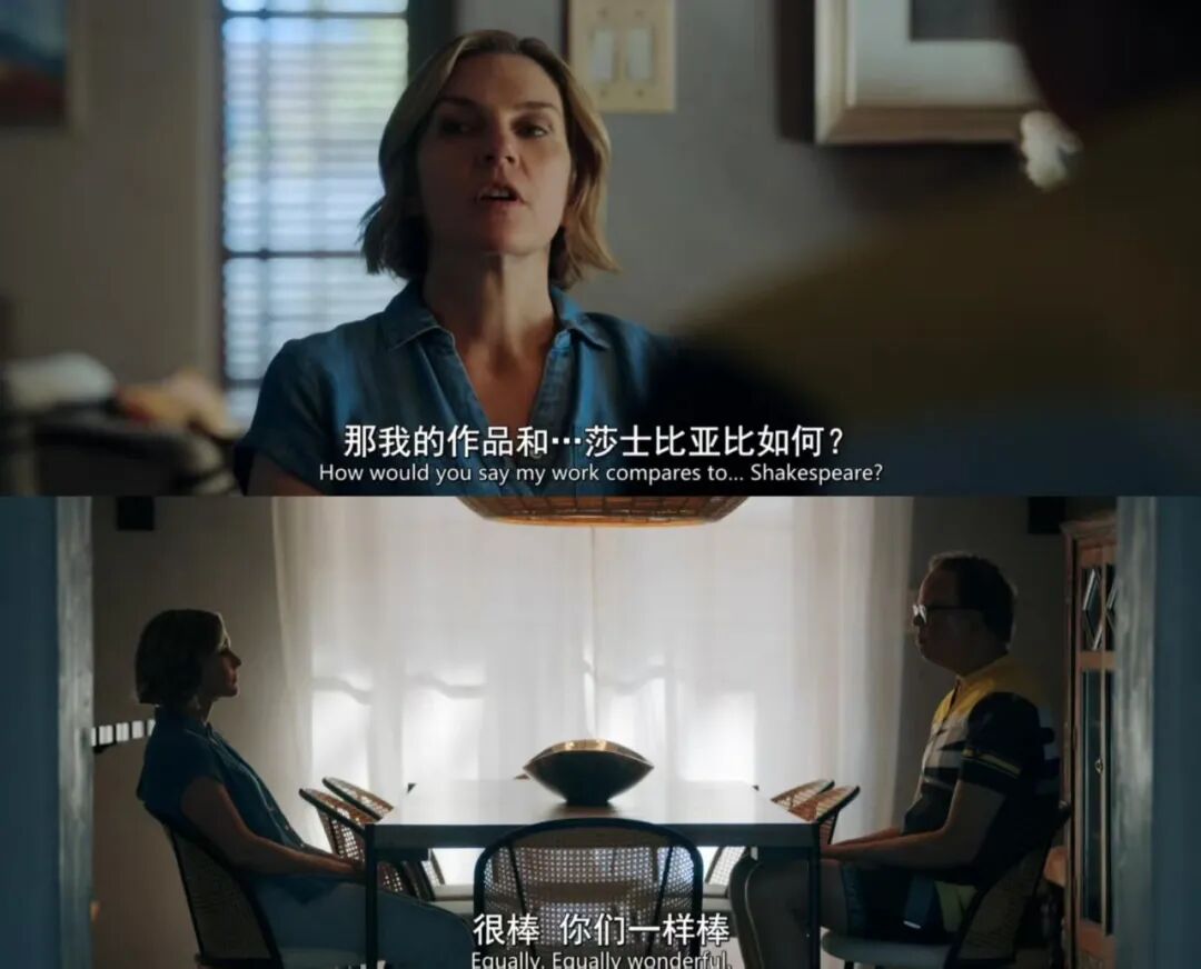 第四集有个场景很能说明问题。由美国著名喜剧演员杰夫·希勒(Jeff Hiller)扮演的一位感染者称自己非常喜欢卡罗尔的小说,还说卡罗尔和莎士比亚一样伟大。卡罗尔反问对方喜欢她小说的哪部分,对方却答不上来,只能泛泛地说:“所有部分我都喜欢”。