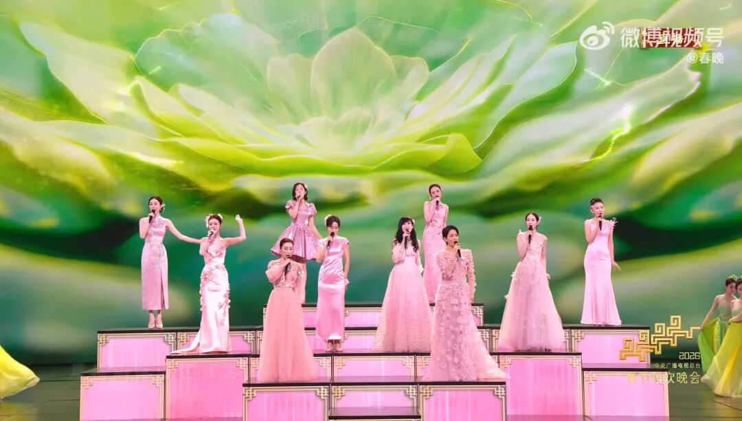 歌曲《立春》以“万物复苏”为基调,刺绣、编织技艺等非遗元素融入服饰,浅粉色礼服搭配翠绿舞美,“人间向暖草木发”。