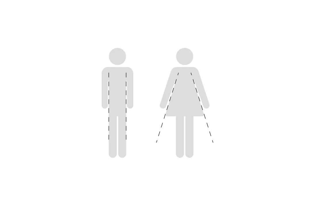 在大量案例中,他注意到一个有趣的规律:无论图标风格如何变化,大多数女性符号都有一个共同特征:身体下方的两条线向外展开。设计史通常把这一形态解释为裙摆,但如果暂时拿掉“裙子”这一概念,它其实更像是一种结构。“如果从纯形态上看,它其实就是一个‘八字形’,”王铭阳解释,“两条线从身体中间向外展开,人们看到这个轮廓,就会自然理解为女性。”