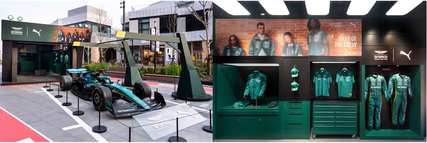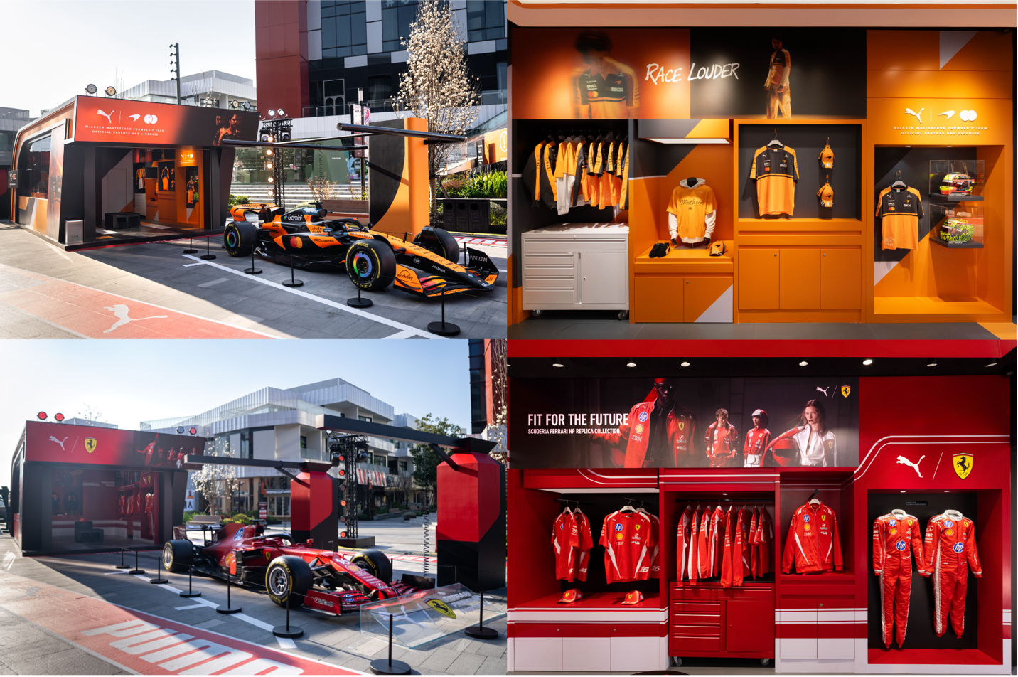 快闪空间整体以 F1 赛事核心场景为蓝本,高度还原McLaren Mastercard F1 Team、法拉利惠普F1车队、阿斯顿·马丁沙特阿美F1车队的赛车及P房实景,并延伸出PUMA NITRO科技空间与 Lifestyle 潮流空间,呈现出PUMA独一无二的先锋品牌文化。一条象征速度与激情的跑道贯穿全场,巧妙串联起各区域,营造出兼具专业竞技氛围与时尚张力的沉浸式聚场。
