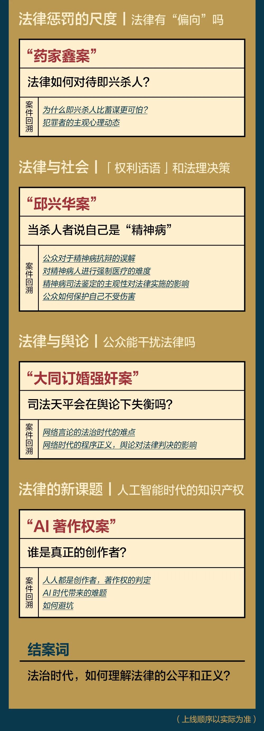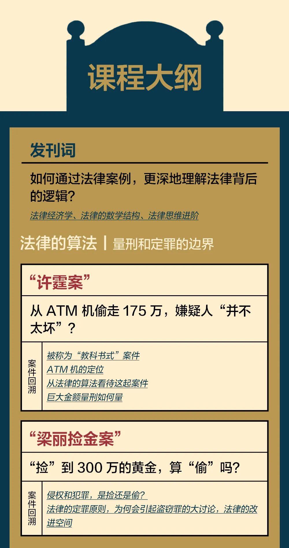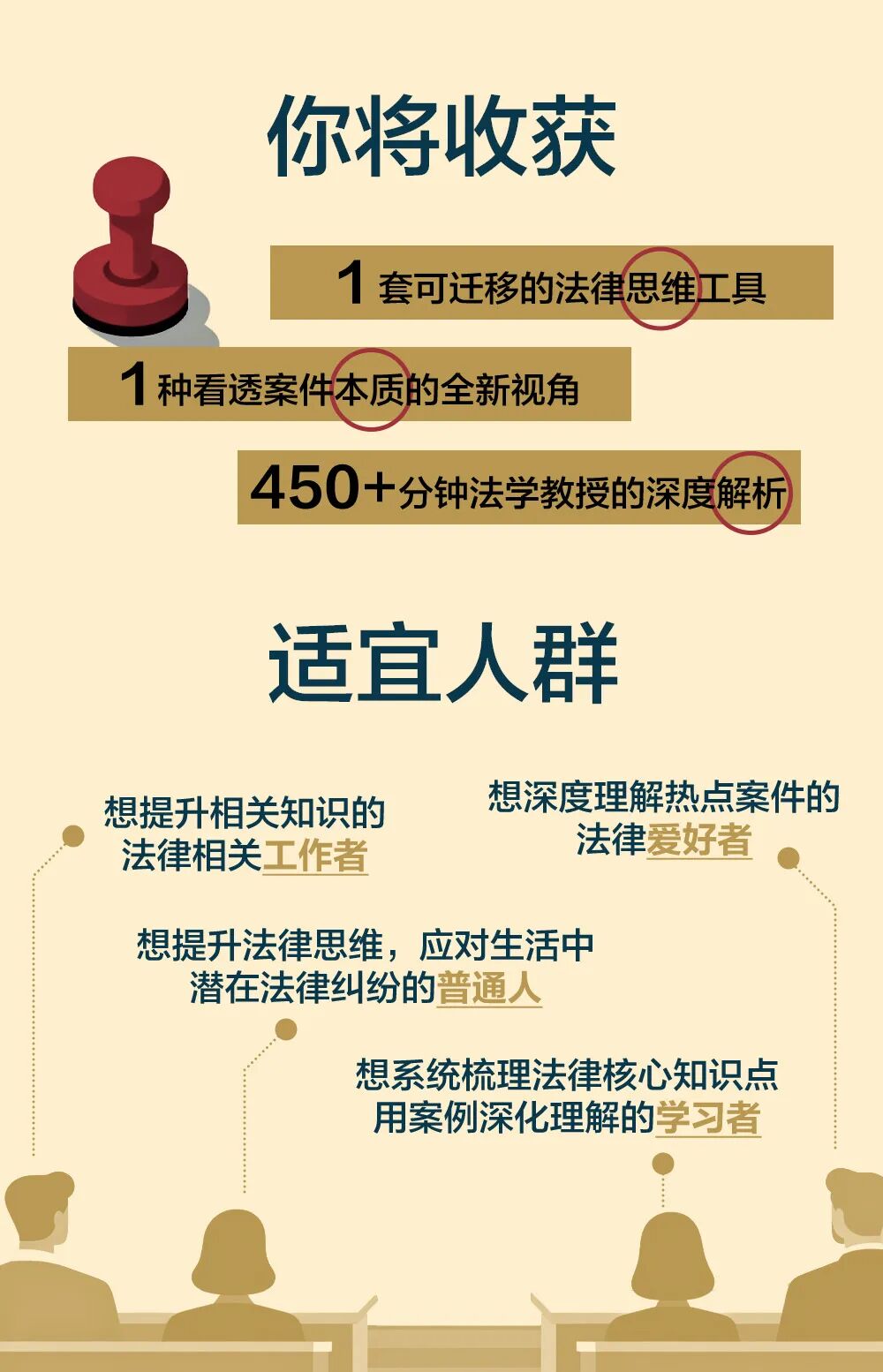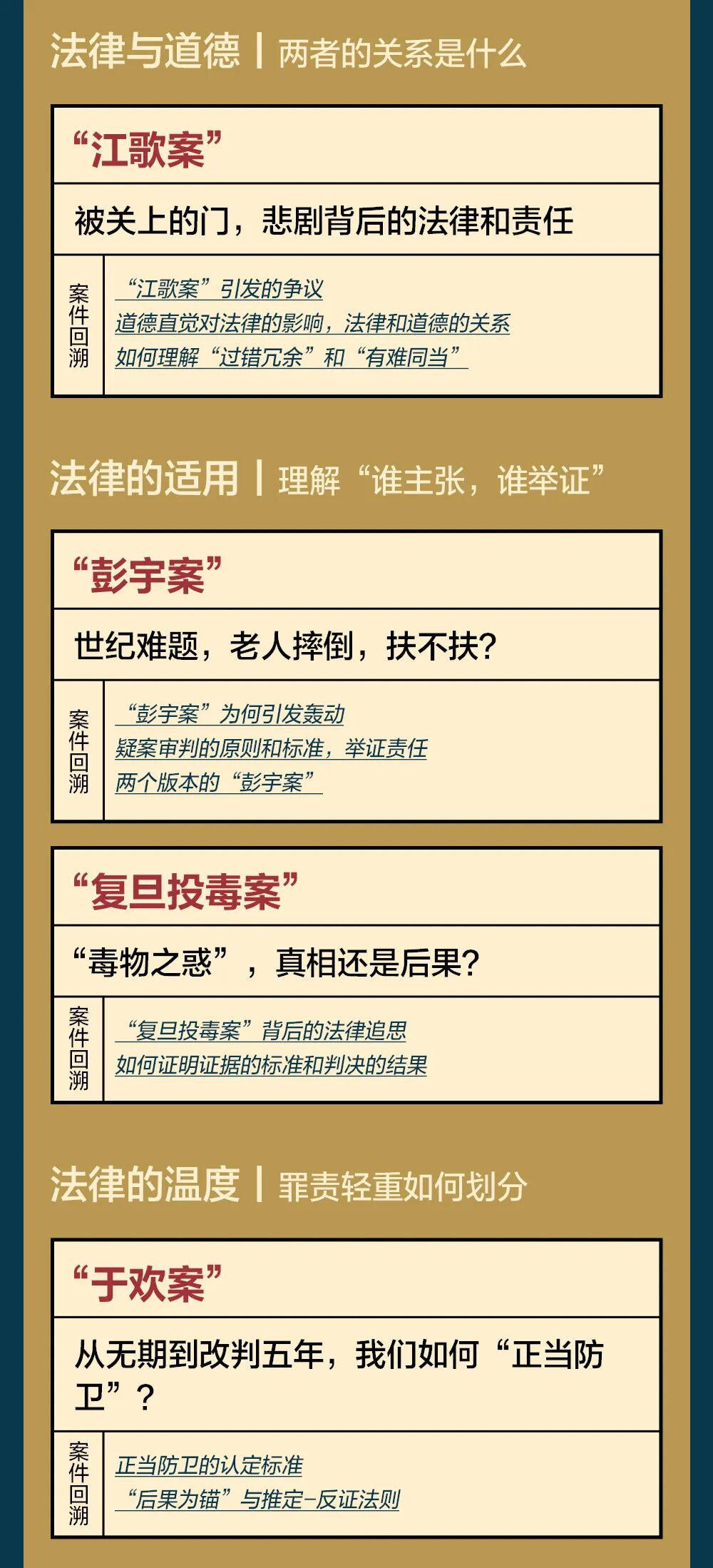 课程精选“江歌案”、“彭宇案”、“许霆案”、“于欢案”等十个教科书级别的烧脑案件,不做简单的“案件回溯”,而是深挖细枝末节: