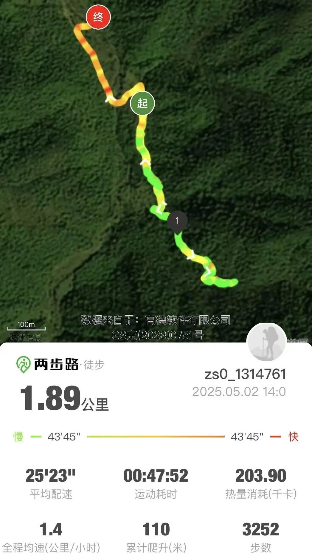 从古树群出发的1.89公里登山路线,累计爬升110米。