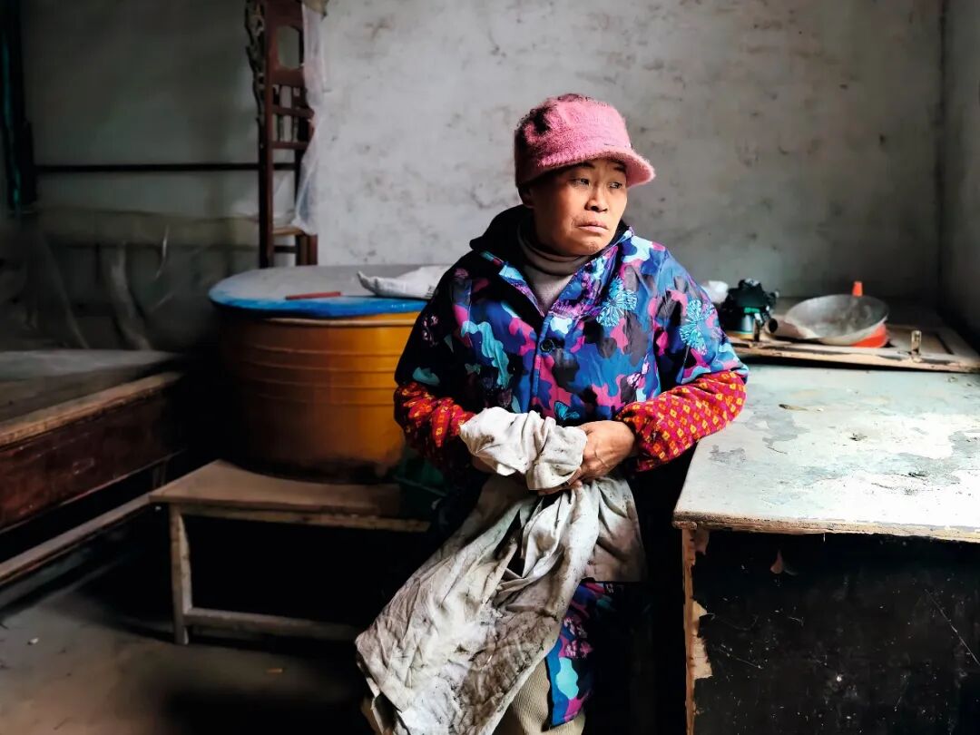 3月2日,在湖南新宁县向阳村,李海玉坐在家中,手里攥着弟弟生前穿过的衣物(孤鸿 摄)