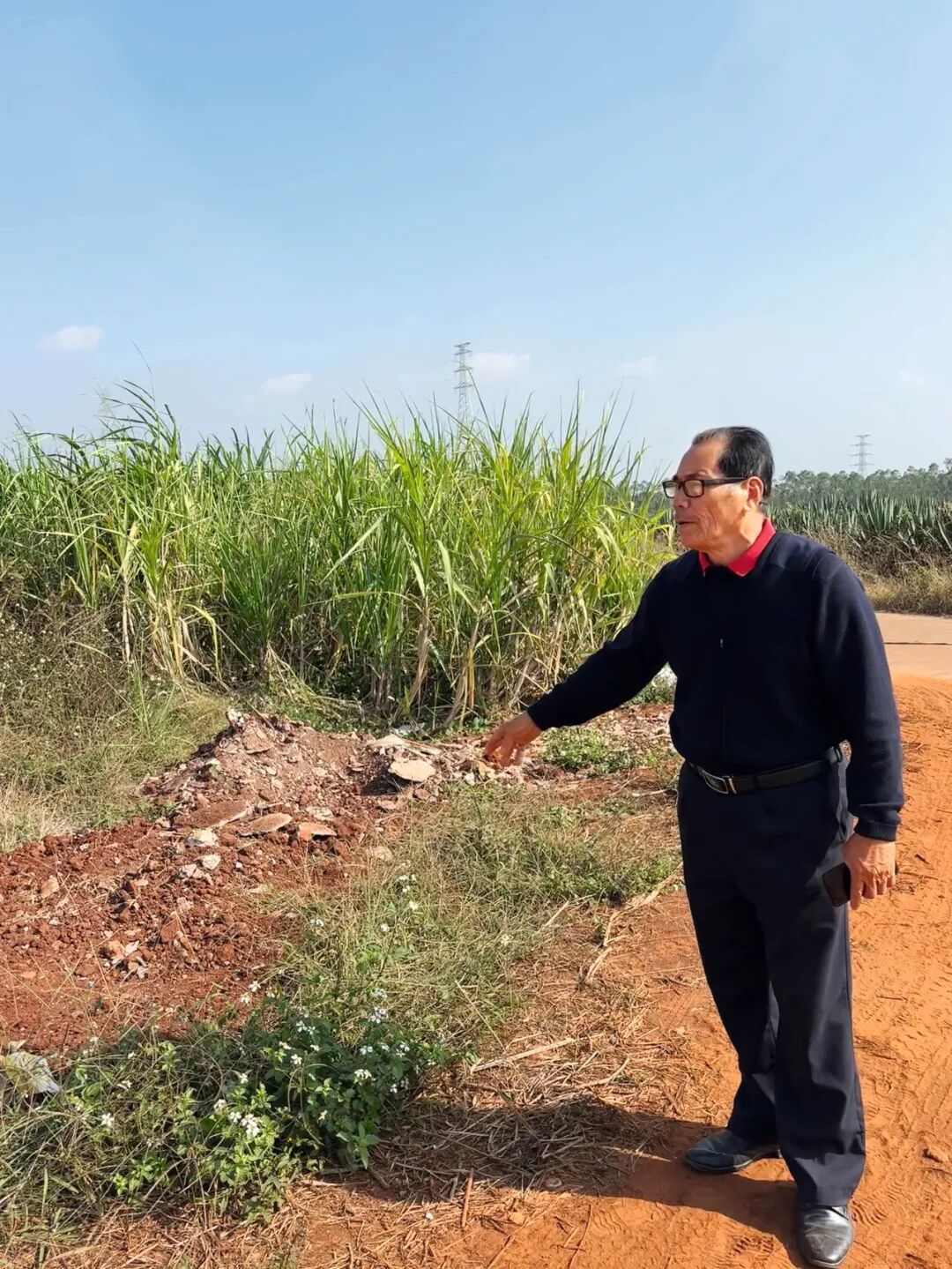 广东雷州市鹅感村村民官卫东当年参与了认尸和埋葬事宜,2025年12月底,他在鹅感村再次为李海玉指出他记忆中的埋葬地点(魏昭阳 摄)