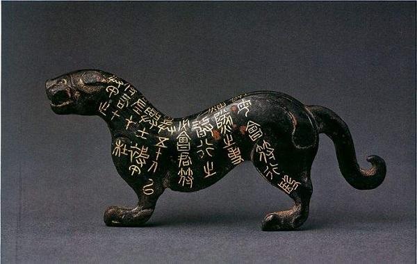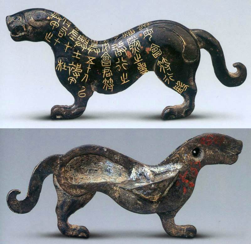 说到错金镶嵌的工艺,西汉时期是顶峰,像满城汉墓、大云山汉墓,包括现在的海昏侯墓出土的车马器、兵器上的错金工艺都是细如发丝,栩栩如生,那时的错金工艺真的到了顶峰。我们看杜虎符,虽然是用了错金工艺,但是非常粗犷,它的金丝绝对不是像头发丝那样细,汉代可以做到这样。它的金丝都很粗,差不多将近半毫米,把半毫米的金条嵌进去,打磨,把字给写出来,是不惜工本的。做了这么多的字,可能要有好几克的金丝,才能去把字给弄起来。不像汉代,一个头发丝这样的东西嵌进去,就可以解决问题了。所以大家如果想要了解错金工艺在战国晚期的工艺特征,这件文物是值得去欣赏的;