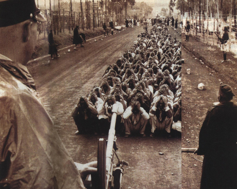 肯尼亚反抗英国殖民统治的“矛矛运动”嫌疑分子蹲在地上,等着被送进拘留营